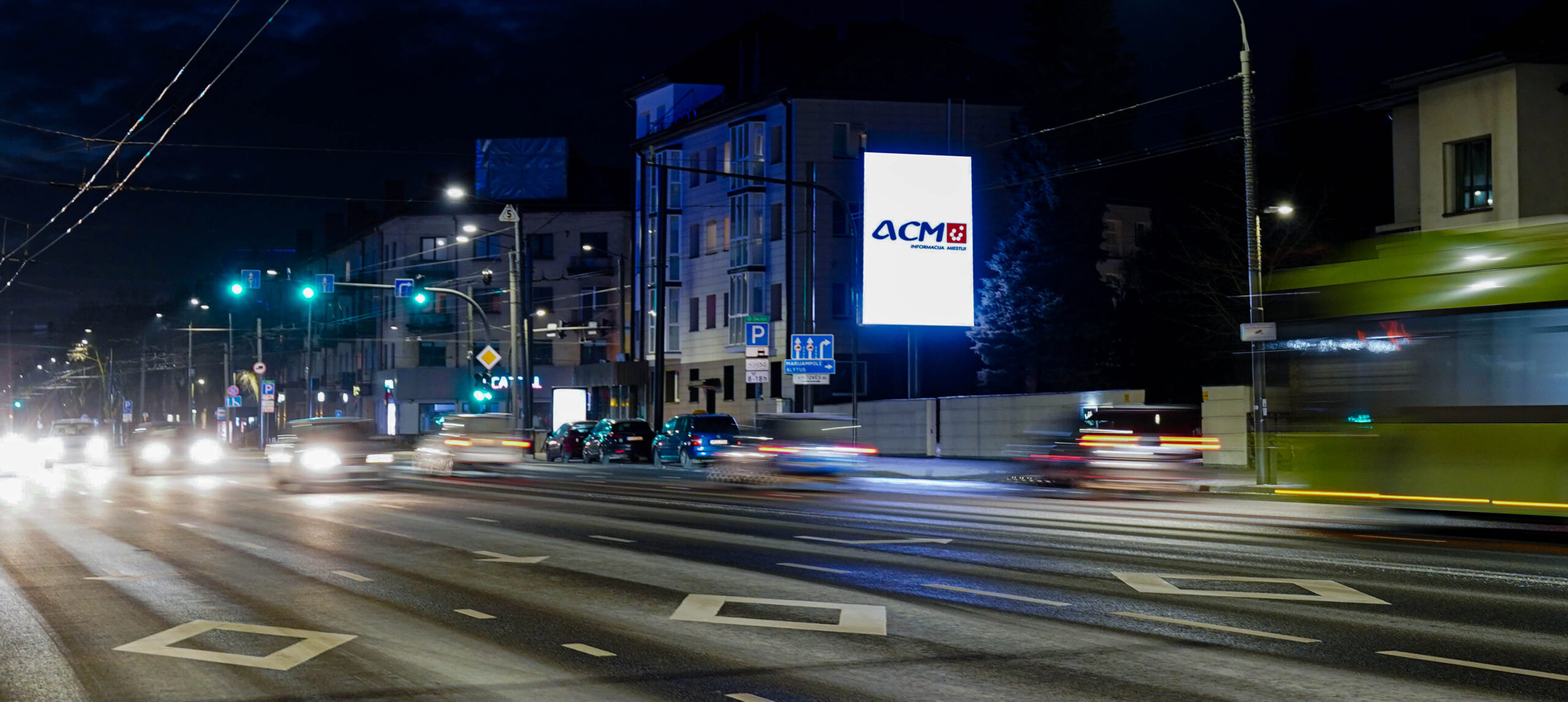 Užsisakyk jau dabar! ACM kintamojo vaizdo ekranas „Aklųjų sankryža“ – tai tavo reklamos vieta viename judriausių Kauno transporto mazgų. Pasiek tūkstančius miestiečių ir pravažiuojančių kasdien. Būk matomas ten, kur susijungia pagrindiniai srautai ir kur žmonės priima sprendimus – reklamuokis strategiškai ir efektyviai!