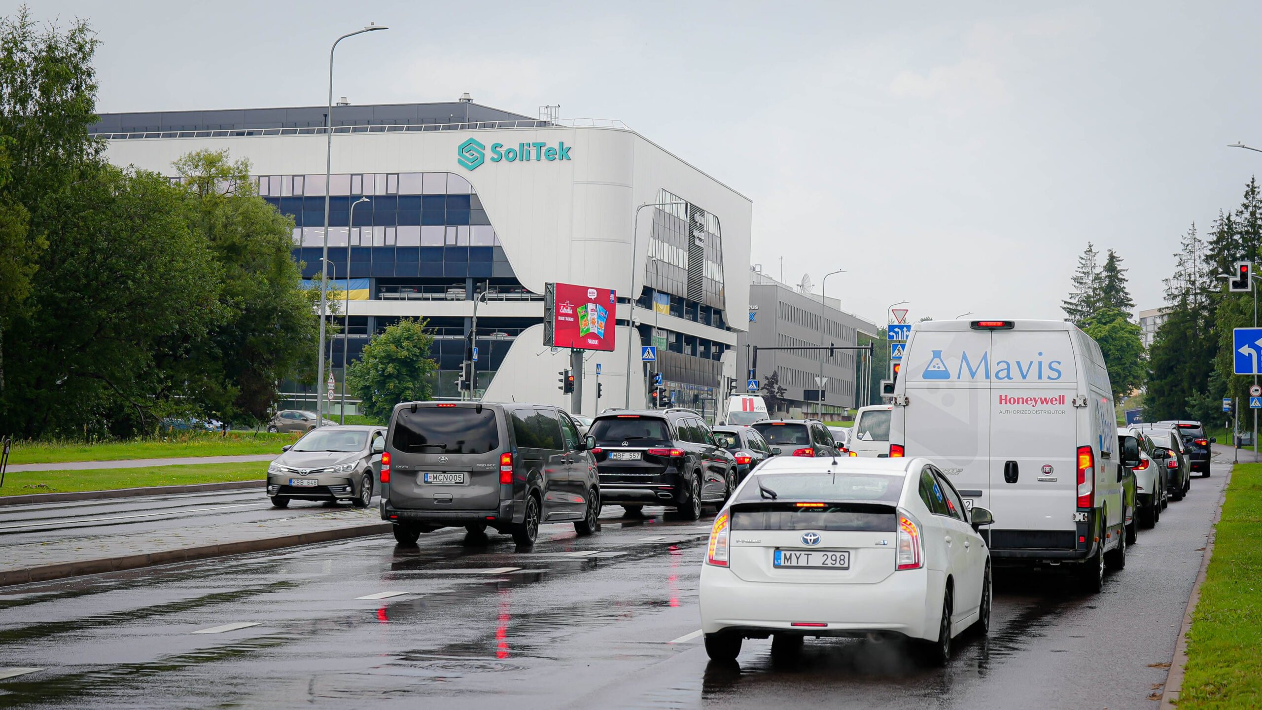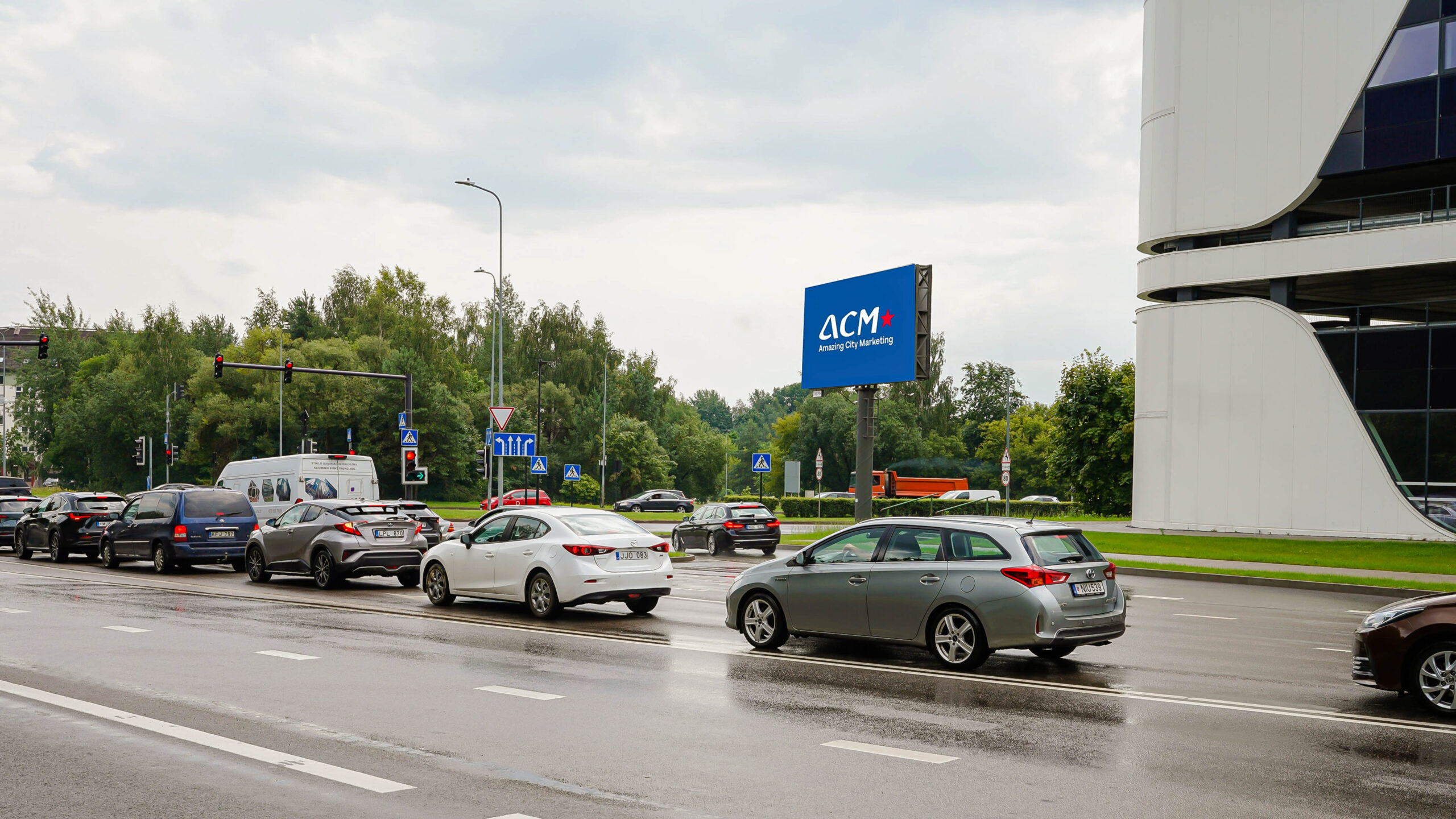 - Šviesoforu reguliuojama sankryža – transporto priemonės dažnai sustoja šalia ekrano, ypač piko metu, todėl vairuotojai ir keleiviai turi daugiau laiko pastebėti ir įsiminti jūsų reklamą, didinant jos poveikį.