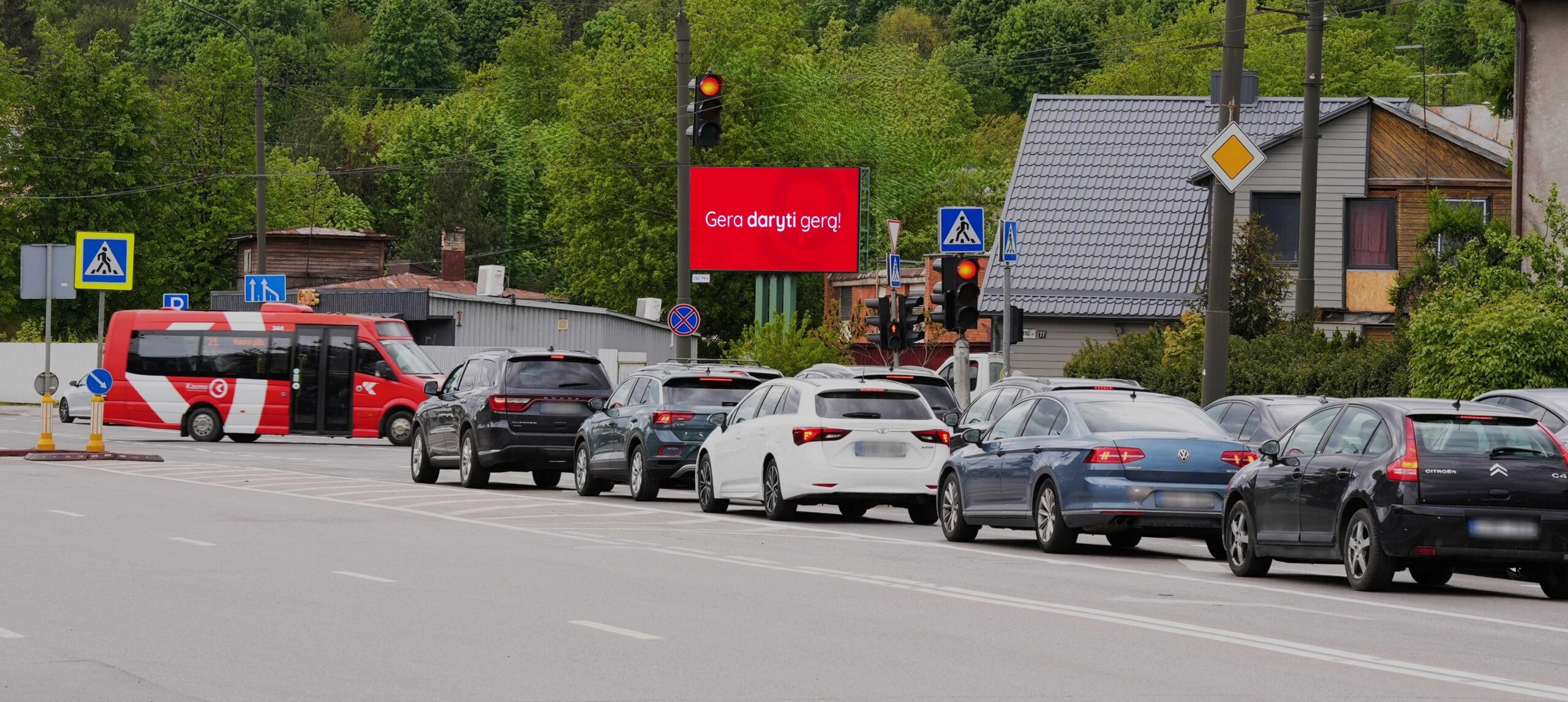 - Stiprus vizualinis kontaktas – šviesoforai ir sustojimo taškai. Ekranas įrengtas šalia šviesoforu reguliuojamos sankryžos, todėl reklama išlieka žiūrovo akiratyje ilgiau nei įprastai. Tai didina žinutės pastebėjimą ir įsiminimą.